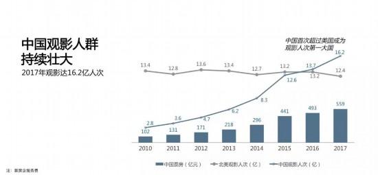 2010年以来,中国电影的产业化进程步入高速发展期。电影票房从2010年的101亿元增长到2017年559亿元,增长453%,2010年-2015年间复合增长率更达34%,相关数据显示,预计2021年中国电影票房将超越美国成为世界第一。